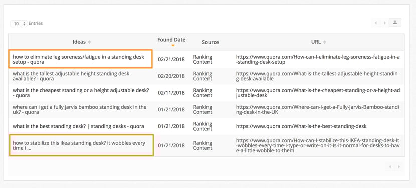 Here’s a snapshot of questions people asked on Quora about a standing desk. Note two specific questions that could easily be converted into topics relevant to people at different stages of the buying cycle: