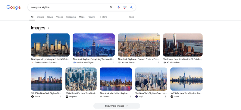 One way the SERP feature can appear is as a horizontal carousel at the top of the results page. Take a look at this image pack for the keyword “new york skyline.” Note that users have the option to expand the image pack if they click “Show more images.”
