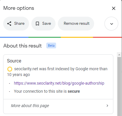 Three dots will now appear next to most search results. Clicking them will reveal in a panel showing more information about the site.
