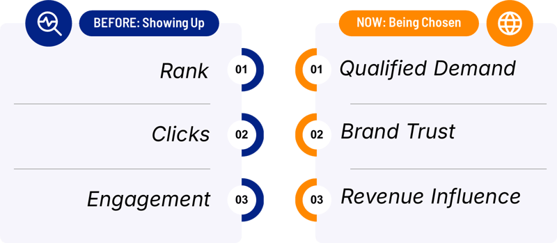 We used to rely on rankings and traffic, but those metrics only proved visibility, not influence. And in a world where buyers get answers without clicking, the game has changed. The only question now is: what matters? Did we actually get chosen?