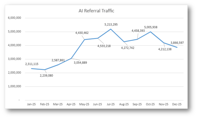 Chris: Many of you have probably seen the same type of reports around the trajectory of AI referral traffic. We saw, especially early last year, this incredible spike in the amount of traffic coming to websites. It wasn't necessarily the volume of traffic that was so impressive, it was the trajectory and how quickly it rose.