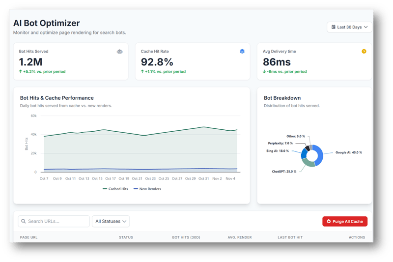 Rendering, structure, and feeds work together. Missing any would break interpretability. To solve this, we built Bot Optimizer. It sits between the AI search bots and your website. Anytime a bot tries to access the site, it serves a fast, fully rendered version.
