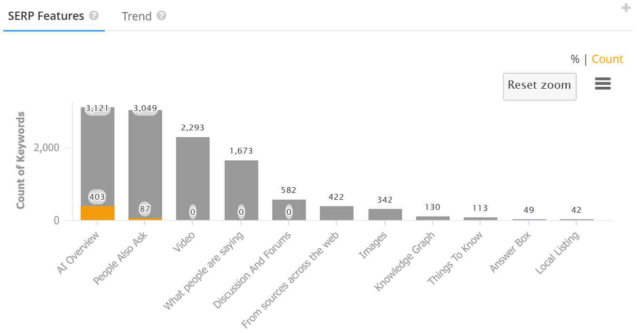 This will give you the full understanding of the SERP in your space, and what features you need to target. For example, if the majority of keywords show images and videos, then these are the two features that you should start obtaining. If, on the other hand, you see Reviews or AI Overviews being featured prominently, then focus on optimizing your content for them first.