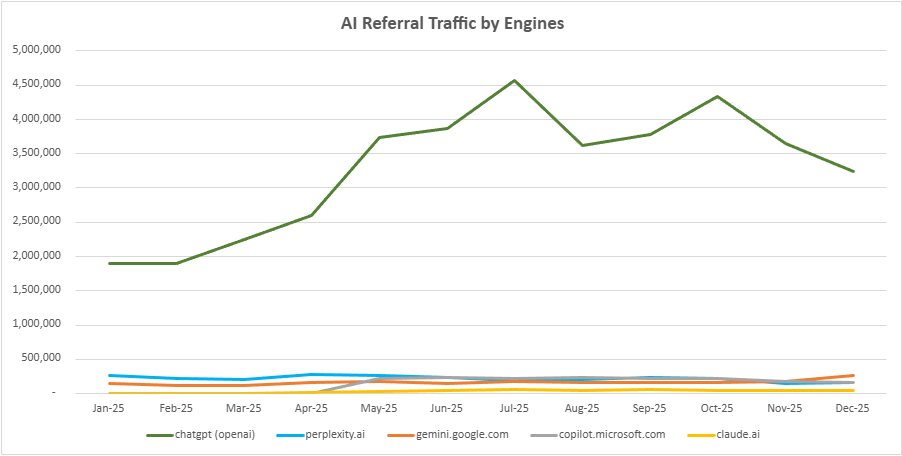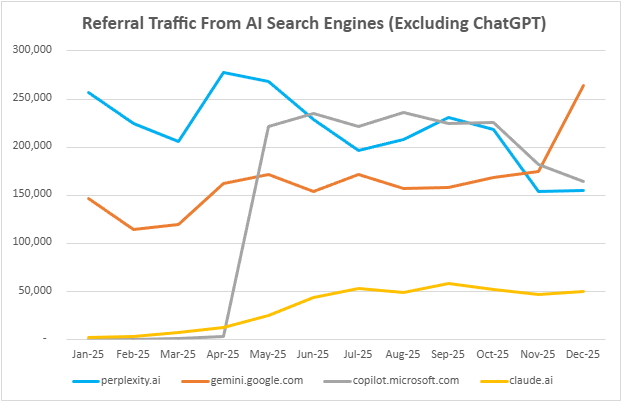 Excluding ChatGPT, here is a clearer view of the referral traffic from Perplexity, Gemini, Copilot, and Claude month-over-month.