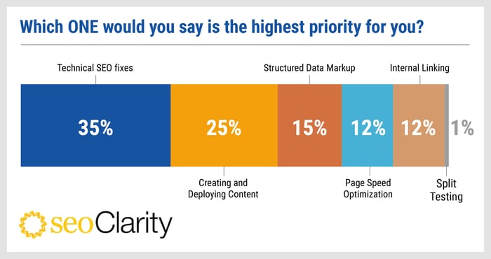 When we asked respondents which is their ONE top priority, 35% said technical SEO fixes. This is followed by 25% who consider creating and deploying content to be the main priority. Tweet